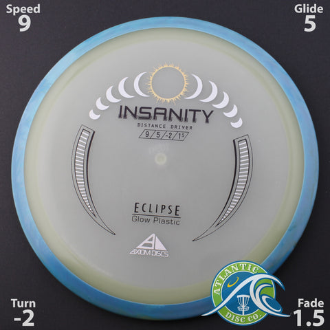 Eclipse Insanity – The Insanity is a slightly understable dream of a 9 speed. Giving players big time control and solid distance with the same disc. The Eclipse plastic is some of the best glow in the game and it has a ton of durability. This is a mold that everyone should throw no matter your skill level. Make sure you test out the Axiom Eclipse Insanity today.