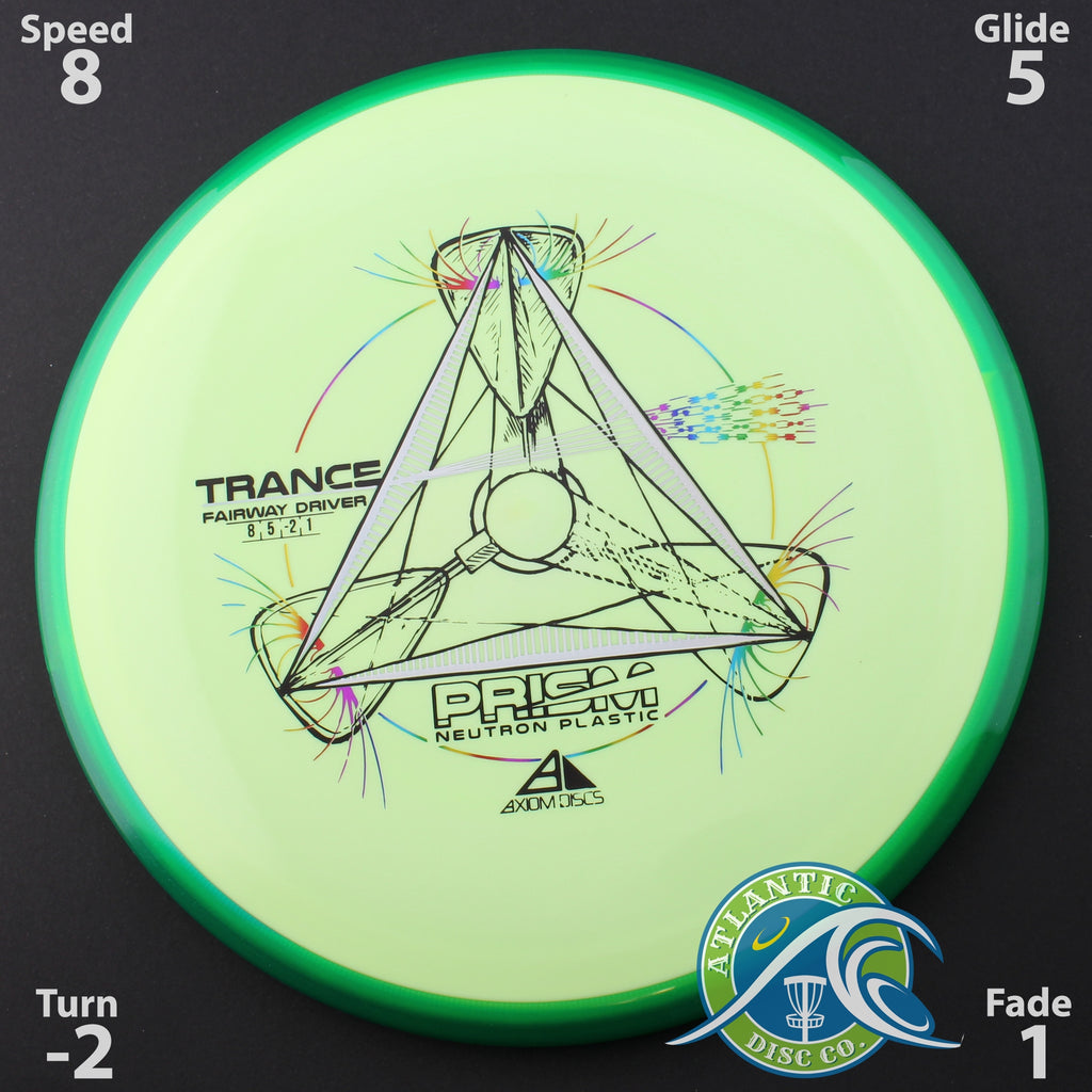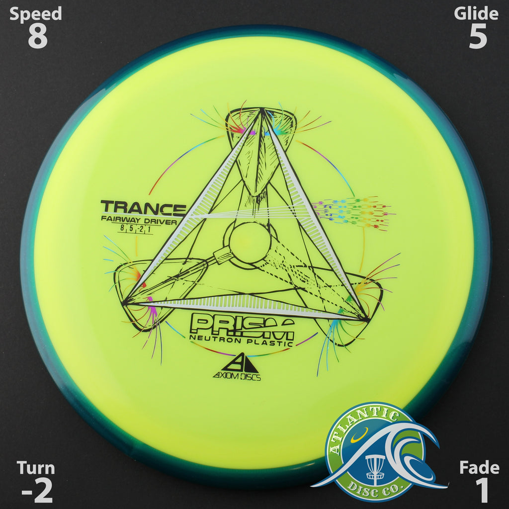 Axiom says this about the run: “First released as part of the 2023 OTB Open Special Edition discs and again for the 2024 OTB Open, the Trance is now available as a stock offering in Prism Neutron plastic! Developed to be a fairway driver that any player can use, the Trance comes in with flight numbers of 8 | 5 | -2 | 1, making it an exceptional disc for shot shaping – mesmerizing turnovers, dead straight flying hyzer-flips, and reliable flat to turn shots with a straight pushing fade, the Trance can do it all. Now available all year round, get your own Prism Neutron Trance and start carving up the fairways!”